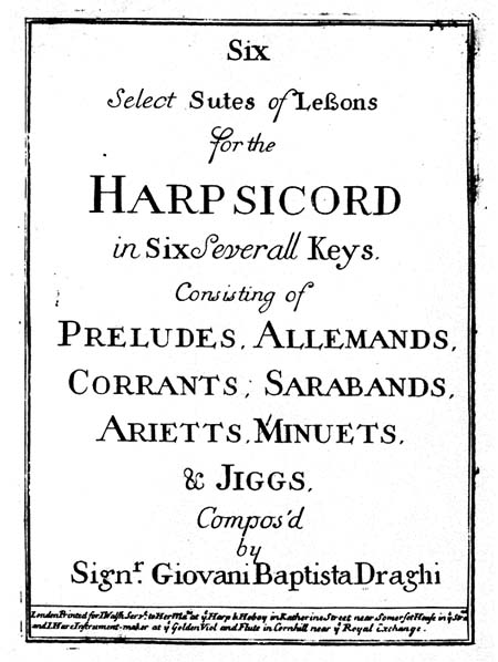 85 pieces including the Six Select Su[i]tes of Lessons for the Harpsichord in Six Severall Keys. ... by Signr. Giovani Baptista Draghi (London, 1707) and 48 additional pieces from several manuscripts